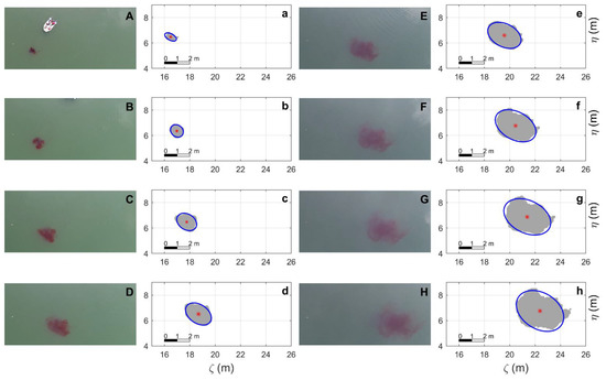In Figure 4, the main characteristics of the dye patch extent mapping are shown. The images show a dye patch dispersing over time. The first image shows the dye patch after several seconds of release, whereas the last was taken before the patch was not identifiable, due to the reflection of the cloudy sky. The evolution of the corresponding binary image and the optimal ellipse is shown on the right side of Figure 4a–h. It is worth noting that during this experiment (19 July 2018), a light breeze was registered of less than 4 km/h, but enough to displace the boat that was drifting freely with the motor turned off so as to not interfere with the dye patch. Other conditions measured during this experiment were the air temperature of approximately 20 °C, the surface water temperature of 21 °C, and a stratified water column, creating almost ideal conditions to carry out the experiment [40].