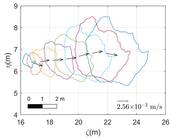 The spatial evolution of the dye patch shows a tendency to the right due to the wind forcing at the site. It was observed that the dye patch was advected ~6 m with an almost homogeneous dispersion of approximately 1 to 5 m of extension for 290 s. The positions of the geometrical center at each time are shown in Table 1. From the comparison of two consecutive patch contours, the velocity data were obtained according to Equation (14); see Figure 5.