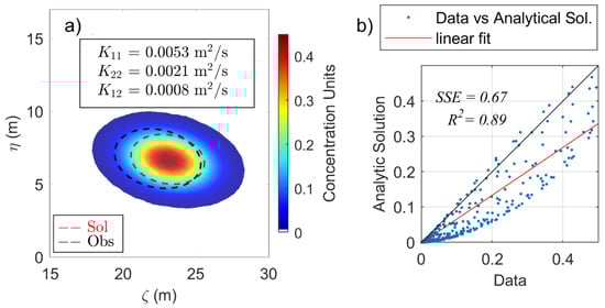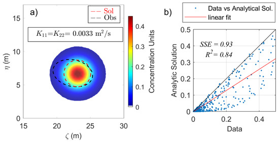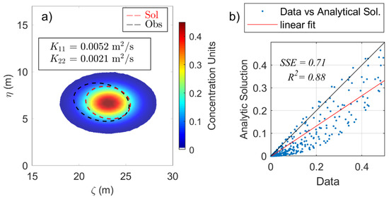 (a) Concentration contours obtained with optimal diffusion coefficients for and . Observations are shown in black and the solution in red. In (b), the dispersion diagram of the data and the analytical solution with SSE and is shown.