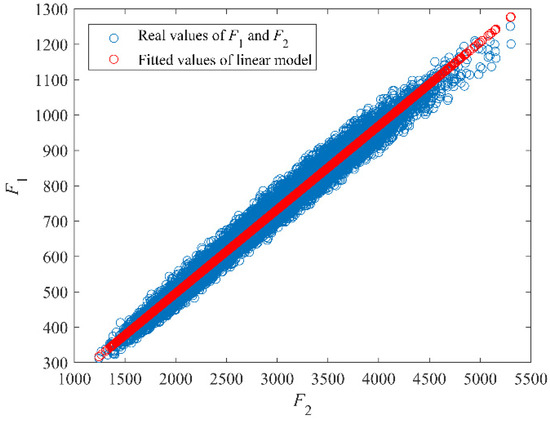 where a and b are the fitting coefficients (slope and intercept) of the linear model and can be readily obtained by MATLAB toolbox. The fitting results (red points) are shown in Figure 4. Thus, the objective function Equation (1) can be approximated by a linear formula in Equation (17).