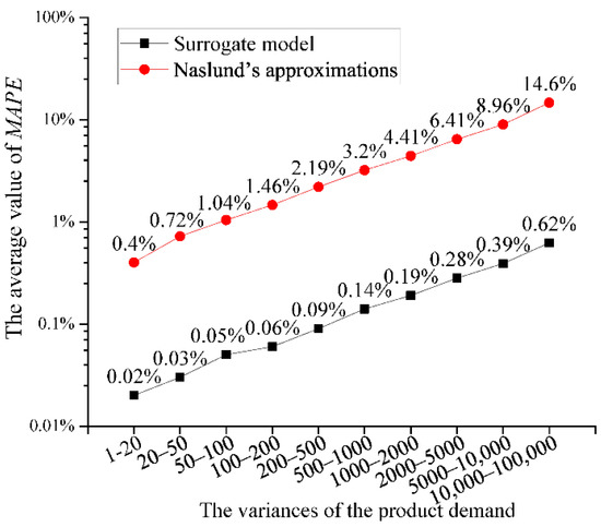 It can be seen that when the expected value interval is fixed, as the variance interval increases, MAPEs of both Naslund’s approximation and the surrogate model increase. The average values of MAPEs of the surrogate model are obviously lower than those of Naslund’s approximation. Even when the value of variance is much larger than expected value, Var(Dcp) [10,000, 100,000], the surrogate model still maintains a lower average value of MAPE (0.62%).