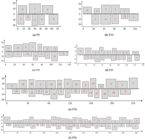 As the problem size increases, the computational time required for EM increases greatly. The EM can only find the optimal solutions of LP2 for P8 and P10. For other problem instances, the EM is able to find the feasible solutions within the given runtime. With the increase of scale of problem instances, LS-EA and HS-LP have significant advantages over EM. Although HS-LP is given longer runtime than LS-EA, LS-EA outperforms HS-LP in terms of average material handling cost on all problem instances except for P8. The best solutions (layouts) found by LS-EA for all problem instances are shown in Figure 6.