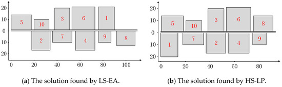 To verify this speculation, the maxO in LS-EA is set to 20 to make LS-EA experience a larger runtime. MAX_k in HS-LP is set to 30 to ensure that ITER and MAX_k have similar values. Table 4 presents experimental results of LS-EA and HS_LP for problem instance P10. LS-EA can find the same solution as EM in each run when giving a larger maxO value. However, HS-LP cannot improve the solution quality under longer runtime. Figure 7 shows the best solution found by LS-EA and HS-LP for P10. We can see that the offset of the solution obtained by HS-LP is much smaller than that of LS-EA. This means that for some specific problem instances whose optimal solutions have large offsets, LS-EA can find a much better solution than HS-LP by setting a suitable value of maxO.