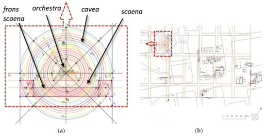 scaena, which corresponds to a polygon that closes the perimeter of the theater on the opposite side. They extended two straight lines tangent to the semicircle of the outer perimeter of the