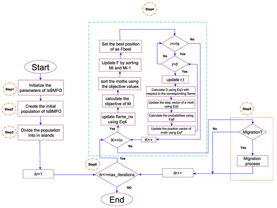 ————Identification of the IsBMFO parameters——————— Set the IsBMFO parameters , n, d, , , , ————Initialize the IsBMFO positions——————— Initialize the positions of moths 0: ———Split IsBMFO into a group of islands———————— Flag(y) = False, for K = 1 : do for i = 1 : do select y, where y ∈ (1, 2, …, n) while Flage( y) is true do select y, where y ∈ 1, 2, …, end while Add to island end for end for while