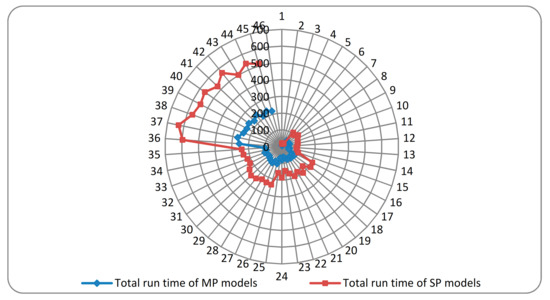 Figure 2 compares the total CPU times of solved SP (red color) and MP models (blue color) solved during the LBBD method for each problem. As an instance for problem number 45 that includes 50 parts with five parallel machines the total CPU time of solving SP models is achieved as 514 while the CPU time for obtaining solution of MP models equals to 220. Therefore, it could be seen that the total SP models run times are larger than the one for MP models. This is known as SP problem complexity as it identifies the parts’ sequence and transportation operations’ sequence, while the MP just determines the machine assignments for the parts.