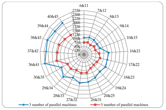 Figure 3 represents the pair wise differences between obtained makespan with three and five available parallel machines in the manufacturing cell. It is clear that the difference of achieved makespan between three and five parallel machines increases as the number of parts is made larger. For example, the terms 6 and 11 in Figure 3 defines the differences between makespan obtained in problem numbers 6 and 11 where there are three and five parallel machines. The blue and red lines specify the issue when there are three and five parallel machines in the robotic cells, respectively. There can be a conclusion that the increase of parts in robotic cells, increases the number of parallel machines to be more effective (see Table 2).