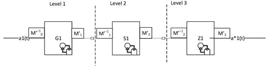 However, in practice, all CS elements’ characteristics, except the communication conduits, are not linear; the scale of the flow changes between the input and output. For example, a single alarm signal at the component input can cause an avalanche of related signals, which will lead to an increase in information at the output of the component. To describe the change in the flow scale, the scaling function and its inverse function are introduced into the model (Figure 2). The scaling function provides the transformation and []. So, the service curve of the system for the -th channel with regard to the scaling functions is expressed as: