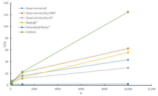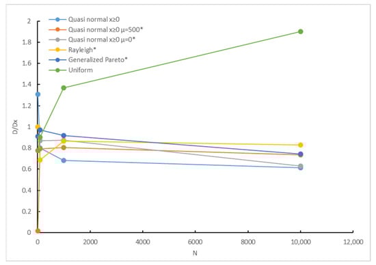 Figure 5 shows the dependence of the ratio , where is the calculated maximum delay in the network calculus method with the service curve calculated with the use of Equation (7) for different probability distribution functions and sample sizes.