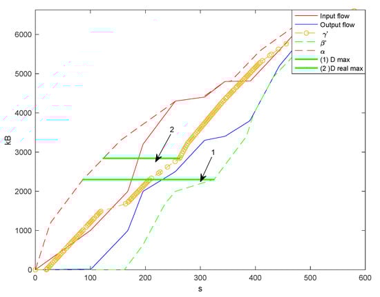 It is known [] that network calculus implicitly assumes the worst combination of conditions for information processing in the system. Graphically, it means that the beginning of the envelope curve consists of areas with the most significant changes in the input flow (i.e., a worst-case scenario that can be predicted from the observed data). For the delay based on the minimum service curve, the worst-case scenario is also the arrival of the largest packet of data when the server is busy and has low performance. When calculating the delay with the maximum service curve, the maximum data size corresponds to the maximum service performance (i.e., when the maximum amount of data accompanies the system’s maximum performance), which is typical for the system’s normal operation.