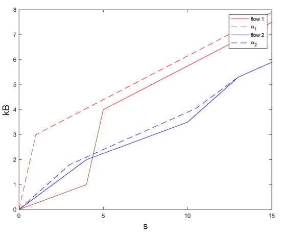 If the service curves can be described by affine functions, then there are fast convolution and deconvolution algorithms for them, which are necessary for calculating system parameters []. As shown in [], the service curves can be approximated by the affine functions similar to the flow envelope and with the same algorithms based on the support vector machines algorithm.