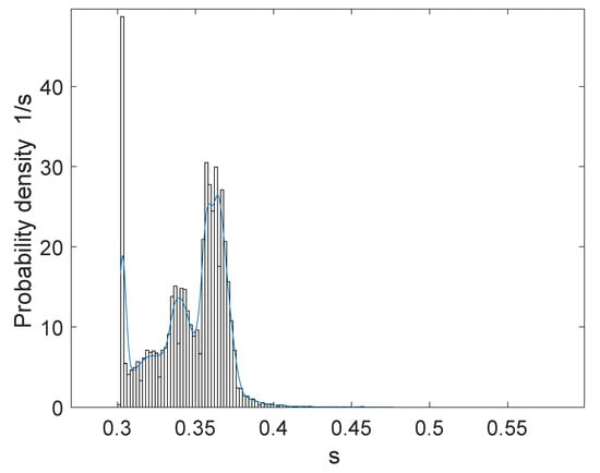 In the course of measurements on a real I&C system, we verified that the empirical distributions obtained from measurements (Figure 9) have a heavy tail. The check was carried out using the algorithm for recognizing distributions with heavy tails [], which, on the author’s tests, showed better results than tests based on the Kolmogorov–Smirnov criteria.