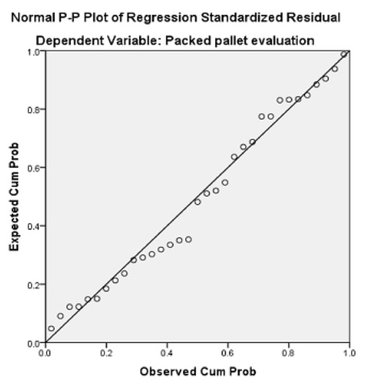 First, a regression was conducted using the two principal components previously extracted and the dependant variable—the Packed Pallet Evaluation variable. To perform this multiple linear regression, the method chosen is called Stepwise. There are multiple iterations, starting with a model possessing only one variable and then progressively adding a new variable and removing others if they are not significant enough to the model [36].