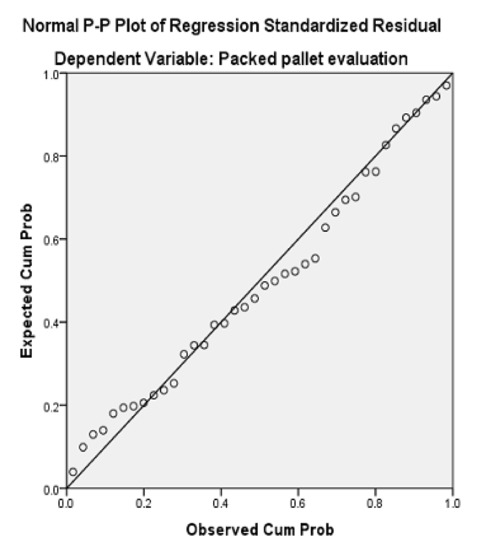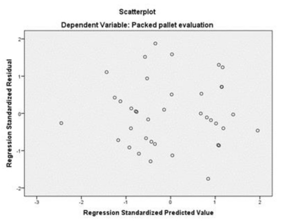 The new test shows that the Adjusted R Square is higher than the ones in previous tests, having the model explain 33.1% of the variance of the Evaluation variable, and the Durbin–Watson value is also good (2.376). The F value is high (19.285) while the sigma value of Bartlett’s test of sphericity is below 0.05, which means that the model obtained is relevant, although only 1 out of 9 variables were kept in the model using the stepwise method. That variable is the Number of Column Piles, which is contained by the Box Quantities component. In Figure 3 it can be seen that the residuals follow the line with no odd deviations, meaning that there is data normality. In Figure 4 the dots are spread in the graphic area, meaning there is data homogeneity. Equation (3)