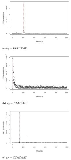 For the first illustration, three words of length were chosen that have been previously shown to exhibit different distances between them and their inverted complements [51]. The words were , and . For each word, the state space of the SMC consisted of the word and its reversed complement, e.g., . First, the basic parameters of the SMC were estimated, namely the transition probability matrix and the sequence of sojourn times. The sojourn time was defined as the distance, i.e., the number of nucleotides that occur between each word and its inverted repeat. The transition matrix and the empirical distribution of the sojourn times were estimated using the empirical estimators. The sequence of the core matrices was calculated as the Hadamard product of the transition matrix with the sequence of the sojourn time matrices. For each word , the first passage time probability was calculated between the word w and its reversed complement according to the proposed analytic relationship (Theorem 1). For a maximum distance, (), the highest first passage time probabilities of the three words and their inverted repeats, along with the corresponding distances are illustrated in Figure 1. Concretely, the first passage time probabilities were calculated for the human Chromosome 1, aiming to estimate the most probable distances between words and their symmetrical complements. More specifically, as presented in Figure 1, we have noted that, for the first passage time probabilities, we have , and approximating the numerical results of previous studies with corresponding values for the arguments and 133 for the three words, respectively [51]. This highlights the fact that specific DNA words exhibit different behaviors and the distance between them and their inverted repeats demonstrates variability.