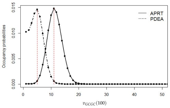 Usually, in vertebrate DNA sequences, the dinucleotide CG occurs less frequently than expected [52]. For the second illustration, we considered CpG islands, which are genomic regions that contain an elevated number of the dinucleotide CG. The human genome contains approximately 30 thousand CpG islands. The APRT gene is an example of a CpG region and it was used for this analysis [53]. This gene provides instructions for making an enzyme called adenine phosphoribosyltransferase (APRT). APRT contains approximately 2500 nucleotides and it had been shown to include an elevated amount of the dinucleotide GC [54]. We modeled the sequence of this DNA region as a homogeneous SMC with state space containing all the two-letter words from the DNA alphabet. The transition probability matrix and the sojourn times were estimated using the empirical estimators. The occupancy distribution for a fixed length of was calculated using the analytic relationship from Theorem 4 in order to estimate the occupancy distribution of specific words up to a specified sequence length. For comparison, we also applied the model to an intron sequence of human’s phosphodiesterase gene (PDEA) [55]. The two sequences are publicly available from the NCBI. The occupancy probabilities are presented in Figure 2 up to length . It is confirmed that the number of occupancies of the dinucleotide GC will be greater in the CpG island compared to the intron sequence. As expected, the occupancy probabilities applied on the two sequences indicated that the occurrences of GCs were more frequent in the CpG sequence.