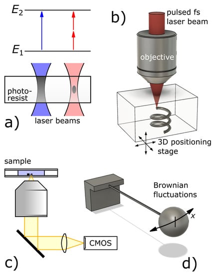 The main steps from sample preparation to measurement. (a) Light-sensitive (photoresist) material exposed to the laser beam. Single photon (left part, in blue) and two-photon (right part, in red) polymerization is depicted separately. (The exceptional spatial resolution can be reached by the two-photon process. The polymerized material is indicated in gray.) (b) The illumination used to produce three-dimensional design in the photoresist volume employing TPP-DLW. (c) Setup for motion detection and data production. The application of a CMOS image sensor, which provides encoded light information about position that can be converted into digital data records by particle tracking algorithms. (d) A closer look at the mechanics of Brownian fluctuations under anchoring conditions. The studied fluctuations in the horizontal plane are indicated by the arrows.