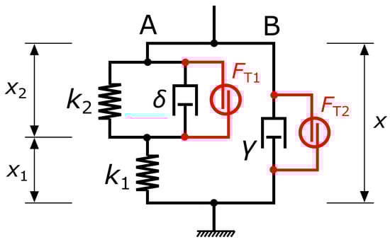 The schematic depiction of the linear mechanical model for the microbead motion. Arms A and B represent the nanowire and the hydrodynamic damping by the surrounding medium, respectively. The internal characteristics , are related to the total observable parameter x.