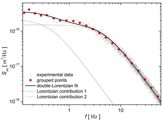 After the successful implementation of the experiment, we obtained data representing the observed dynamics , which we have then transformed into corresponding Fourier images. The aim was to obtain an experimental power spectrum density for the system of frequencies (see Figure 3). Some of the evaluations have been performed according to the work of []. Preprocessing with grouping of the adjacent experimental spectral points is a necessary methodological peculiarity. Frequency and spectrum groupings with eight points over the frequency decade were introduced. The effectiveness with which the representative grouping frequencies were allocated was evaluated. Naturally, the grouping process affects not only the locations of representative frequencies, but also the statistics of spectral points, potentially increasing the regression’s feasibility. The optimization of parametric combinations is made possible by data knowledge. Let us formally encapsulate the unknown model parameters in a single symbol , resulting in the parameterized form of the double Lorentzian model (see Equation (29)). In addition to identifying the optimum, we will focus on estimating errors for various components of .