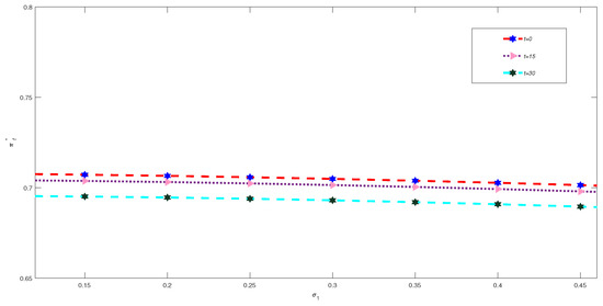Figure 2 shows that the effect of on the optimal investment strategy is negative. The optimal strategy of the investment in risky assets with the employee’s wage decreases with the increasing of the level of volatility. Since the employee’s salary income is not stable and the risk resistance is weak, the administrator will adopt a conservative investment behavior in order to increase the guarantee, that is the funds will be more likely to flow into a risk-free asset product of a healthy income class. In addition, under certain conditions of wage level volatility, the working time is longer, and the ratio of investment to risky assets will gradually decrease. Because the employee’s income has been reduced significantly compared to before retirement, the risk appetite is also reduced. In the process of investment activities, it is necessary to avoid high risk and diversification, and the managers should first consider investment safety and risk prevention, which is mainly based on prudent returns. They are more willing to increase the proportion of investment in risk-free assets.