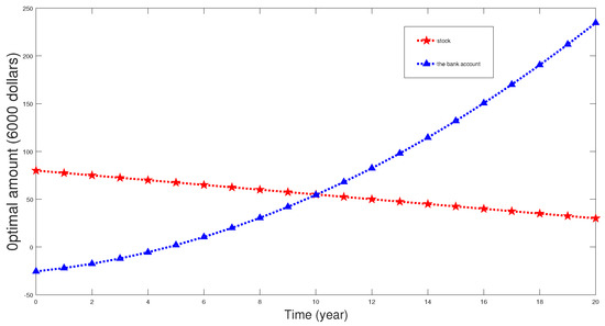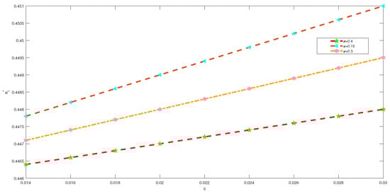 Figure 4 illustrates that the optimal proportion of investment in risky assets is positively correlated with the rate of annuity pension payment c. It shows that c decreases along with the optimal strategy . This is because an annuity pension can be obtained to improve the quality of life after retirement, especially the quality of life of well-paid personnel. The contribution rate of gold is higher, so investor’s retirement can receive a sufficient guarantee. At the same time, under the same conditions, the higher the payment rate, the more secure the investor’s life will be when he/she retires. Because of the high volatility of the stock market, the financial market becomes more unstable. When it comes to risks and benefits, security is generally considered before profitability, and the annuity pension investors will be more inclined to inject funds into the risk-free assets.