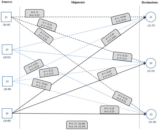 where probabilities , , and are given. It is assumed that random variables and , which correspond to the supply, demand, and conveyance capacity, follow the Weibull distribution, respectively. The Weibull distribution for has three parameters, , , and as shape, scale, and location parameters. Similarly, the parameters for the Weibull distribution for and are also defined. Constraint (4) is the probabilistic constraint for the amount of supply at supply source i, which ensures that with a given probability , the sum of amounts of shipments from supply source i cannot be more than . In a similar manner, constraints (5) and (6) can be interpreted for the demand at demand destination j and the amount of conveyance capacity of transportation mode k.