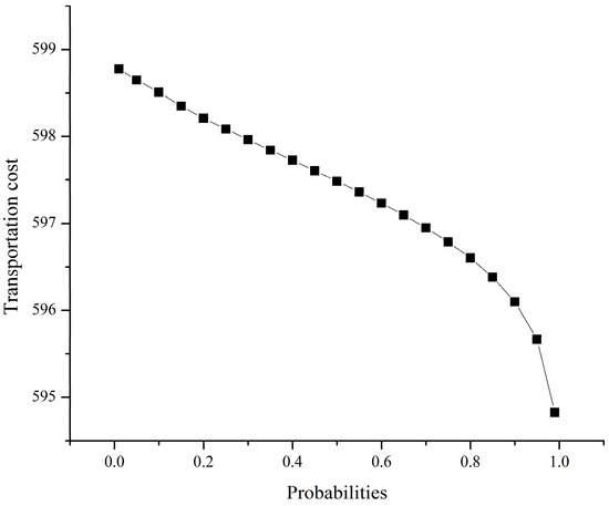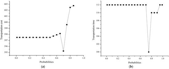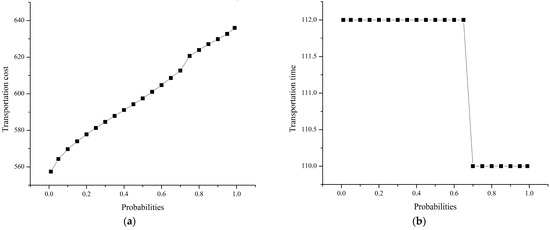 In Figure 2a, the least transportation cost was observed when = 0.7. When 0 ≤ < 0.7, the transportation cost remains the same or increases gradually. When > 0.7, the transportation cost increases sharply. In Figure 2b, the shortest transportation time was achieved when = 0.75. When 0 ≤ < 0.75, the transportation time remains unchanged. When > 0.7, the transportation time increases. This sensitivity analysis indicates that both objective functions of the test problem are quite sensitive to the variation of the probability for . This analysis helps a decision-maker to choose appropriate probabilities for the supply availability.