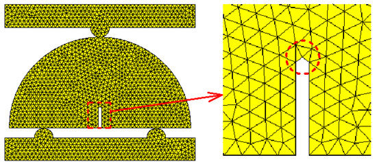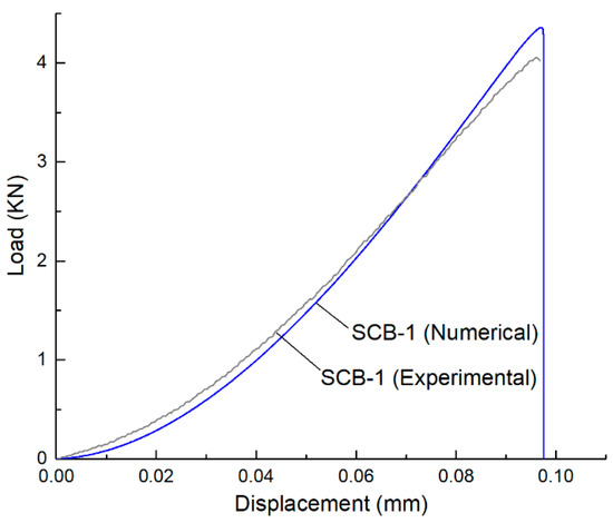 - The notch tip of is a SCB specimen, often an arc, which may lead to the change of the crack initiation position. In the numerical model, there is an angle at the notch tip to ensure that the crack initiation position is in the center of tip. The FDEM numerical calculation method can well simulate the mode I failure mode and the stress–strain curve of the SCB specimen. It can provide important information of the mode I failure process, such as the stress field and strain field, which is difficult to obtain in the laboratory test, and provides powerful help for the study of mode I fracture.