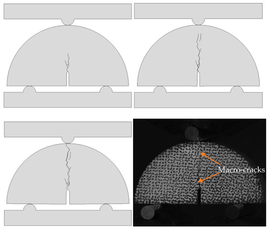 - The fracture process zone (FPZ) of the specimen forms before macro fractures under both experimental tests and numerical simulation. The macroscopic fracture forms inside FPZ in the post-peak region of a load–displacement curve. The macroscopic fracture’s length is behind FPZ’s. The FPZ controls fracture behavior of the specimen.