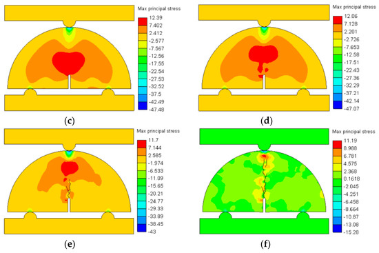- During the loading process, the tensile stress concentration zone of the SCB specimen generates and grows at the notch tip of the specimen. The tensile stress concentration zone of specimens presents a heart shape at peak load. After macro cracks were generated, the maximum tensile stress concentration zone moves upward with crack propagation.