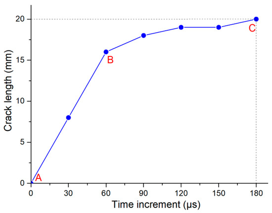 - The crack propagation process of the specimen includes two stages according to crack propagation velocity, namely the rapid crack initiation development stage and the final crack splitting stage. The maximum crack propagation velocity is about 267 m/s and the average crack propagation velocity is about 111 m/s.