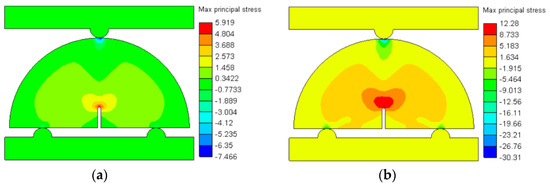 As shown in Figure 6 and Figure 8, the peak load is 4357 N with the maximum vertical displacement of 0.097 mm under numerical simulation. The specimen is in the tensile state, except the part in contact with platen. The tensile stress concentration is initially created at the tip of pre-notch as shown in Figure 8a. The tensile stress concentration zone of the specimen presents a heart shape at the peak stress point as shown in Figure 8c. After the crack is generated (shown in Figure 8d–f), the maximum tensile stress concentration zone moves up with the crack and expands upward until the crack penetrates the specimen.