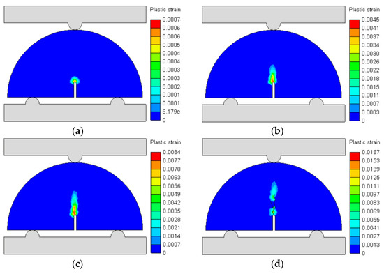 The plastic strain in the numerical model is shown in Figure 11. The area where the strain reaches about 0.5% (0.005) is considered damaged and can be defined as FPZ. The FPZ is first produced around the tip of the notch and then develops vertically upwards. When the specimen is subjected to a load of 4357 N (peak load), FPZ is obvious (red part as shown in Figure 11b). The plastic strain is about 5 mm, and no macroscopic fractures can be observed at this time. When FPZ (light blue part) grows to about 12 mm as shown in Figure 11d, the tip of the notch began to produce macro fractures inside FPZ. Then, the FPZ continues to develop with loading, and the macro fracture continues to occur inside FPZ. When FPZ penetrates the specimen, the bearing capacity of specimen has been reduced to zero.