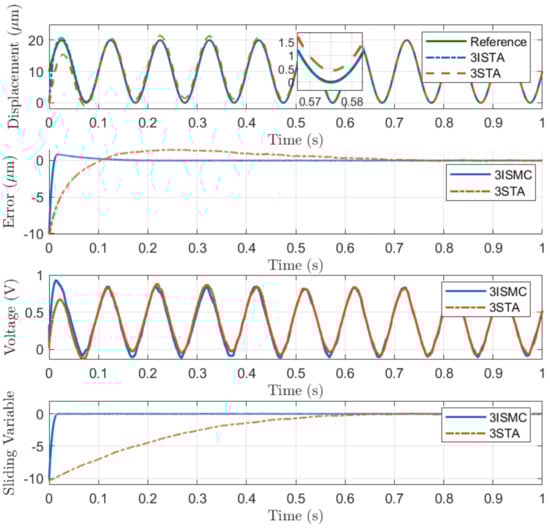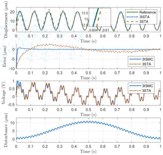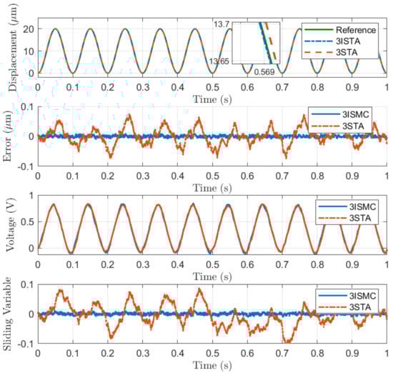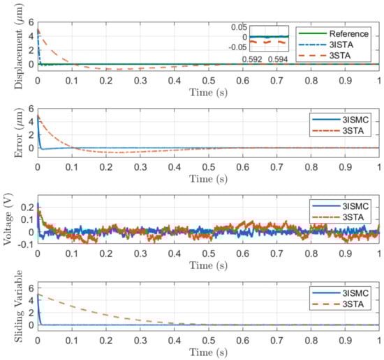 (2) Step Position Tracking: In general, the trade-off between the response speed and overshoot has to be considered during the controller design. The controllers for nanopositioning applications have to be sensitive to minor tracking errors while the overshoot of step response needs to be reduced. Step position tracking is conducted to illustrate the response performance of the proposed 3-ISMC algorithm. It can be observed from Figure 4 that the states exhibit a fast response without the overshoot phenomenon, while the control input keeps continuous. However, the conventional 3-STA algorithm has a weaker performance compared with 3-ISMC.