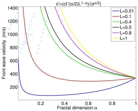 Let us now study the effect of the wavefront speed (Equation (25)) as a function of the fractal dimension (Figure 3). Let us recall again here that for the wavefront velocity in the fractal porous material is equal to the wavefront velocity in the non-fractal porous material . Here, in this example we have the tortuosity equal to and m/s.