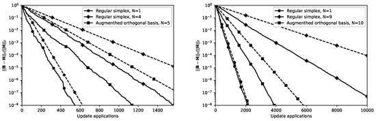Lemma 7. If is a regular n-simplex (), then the MFN update from Lemma 2 improves the Hessian approximation only in its first application.