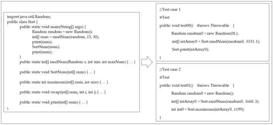 A population of candidate solutions is represented as a test suite [17,22], which is a collection of test cases . Each test case is composed of various statements , where l is the total number of statements. A statement [23] can be a variable declaration or a method call and can be of several different types, namely a primitive, a constructor, a method, an array, or an assignment.