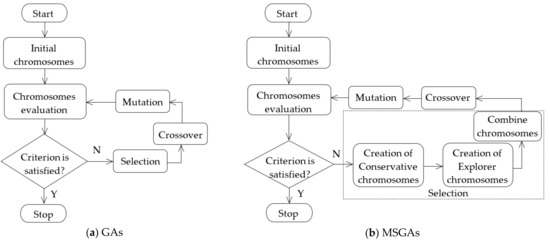 Several researchers have proposed techniques to improve the traditional GA for enhancing its solution efficiency and enabling its application in complex problems. These efforts have relied on adjustments of factors or integration of GAs with other strategies. For example, the monotonic GA [26] involves additional processes after the mutation process in the traditional GA. These additional processes measure the fitness values to determine the best offspring or the best parent for the next population; in contrast, the traditional GA increases the number of mutated offspring in the next population and then calculates the fitness values of all chromosomes. Another improved version of GA is the steady-state GA [27,28], in which the fitness values of the mutated offspring are determined and then the offspring is compared with the parent. If the offspring is better than the best parent, the offspring replaces the parent in the current population. The advantages of monotonic GA and steady-state GA are similar, namely removing duplicate chromosomes and ensuring the best chromosome is not discarded. A breeder GA [29] differs from the traditional GA in that it uses the principle of breeding, which involves selecting the fittest chromosomes and reproducing using those chromosomes. The breeder GA is more precise as it utilizes the science of breeding [30]. A cellular GA [31] is an improved GA that selects the best offspring after the crossover operator has been applied. The best offspring is mutated, and the fitness value is determined. The selection of cellular GA is restricted to the overlapping neighborhood producing slow solutions [32,33]. Table 1 summarizes the characteristic of each GA.