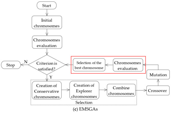 Flowcharts of GA (a) [7], MSGA (b) [7], and EMSGA (c). The red box indicates the additional processes in EMSGA. The black dashed box displays the additional processes in MSGA.