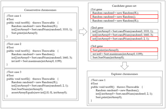 Mechanism of creating explorer chromosome. Red boxes demonstrate which one gene from each candidate gene set was chosen.