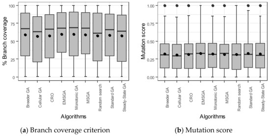 In the experiment, the proposed algorithm was implemented as an extension to the EvoSuite. To extend the new algorithm in Evosuite, a developer must create a new class in the client module and extend the abstract class GeneticAlgorithm. The EMSGA class implemented the basic methods for GA that EvoSuite prepares. In addition, the EMSGA class added some processes for creating two types of chromosomes and selected the best chromosome. Test cases of each algorithm were automatically generated, and problem instances were executed through EvoSuite. The performance of EMSGA was compared with that of the MSGA, traditional GA, monotonic GA, steady-state GA, breeder GA, cellular GA, CRO, and random search. These search-based methods are provided in EvoSuite. The coverage achieved by the algorithms was assessed in terms of the branch coverage metric. Search budget configuration uses EvoSuite’s default of 60 s [41]. Search budget is the time for generating test cases of the algorithm each time. The experiment was independently repeated 10 times.