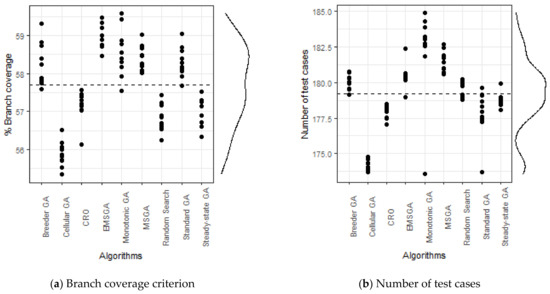 The coverage achieved was evaluated based on the branch criterion, number of test cases (#T), and mutation score. All the experimental results were analyzed via nonparametric Mann–Whitney U tests with a significance level (p-value) of 0.05, the Vargha–Delaney effect size, and a 95% confidence interval for the branch coverage achieved. Boxplots and marginal distribution plots were created using RStudio Version 1.1.383.