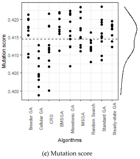 EMSGA achieved the highest branch coverage (0.5900). This means test cases of EMSGA can execute 59% of the source code of the class test. The branch coverage of EMSGA obtained that similar to the monotonic GA. However, EMSGA generated fewer test cases than the monotonic GA due to the limited search budget. Each algorithm had 60 s to search for the optimal test cases for each class. Although EMSGA generated fewer cases, the branch coverage of EMSGA was higher. This means that EMSGA is more efficient than monotonic GA. In terms of the mutation score, EMSGA achieved the best performance. The mutation score represents the number of faults that can be detected in the test cases, which is a measure of the quality of the test cases generated by each algorithm [47]. The measure is a comparison of effect size between the EMSGA and the others; if > 0.5, it means EMSGA can beat that algorithm more than 50% of the time. For example, = 0.74 means EMSGA can beat the monotonic GA 74% of the time. The values of this metric for all the algorithms were found to be greater than 0.5. This means that the EMSGA can generate higher-quality test cases than the other algorithms.