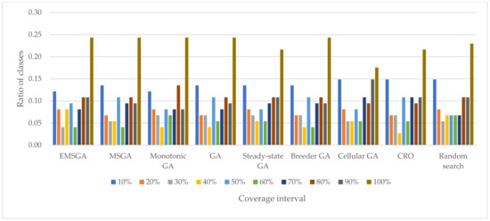 Figure 5 presents the distributions of the branch coverage, number of test cases, and mutation score achieved by each algorithm. Each marginal distribution displays the average of each metric (dashed line) and the marginal density. The marginal density is the solid line on the right side of each marginal distribution plot that indicates the distribution of results. The average branch coverage of all the algorithms was 57.71% (Figure 5a). Five algorithms achieved values exceeding the average, namely EMSGA, MSGA, standard GA, monotonic GA, and breeder GA. In terms of the number of test cases (Figure 5b) as well, four algorithms achieved values better than the average (179.19 test cases), namely EMSGA, MSGA, monotonic GA, breeder GA, and random search. All algorithms exhibited mutation scores above the average (0.41). Thus, EMSGA achieved values exceeding the average for all three evaluation metrics. The ratio of classes reached branch coverage within each 10% branch coverage interval, as shown in Figure 6. For example, 35% of all classes that were tested in the test cases generated by EMSGA achieved a branch coverage between 81% and 100%. From the experimental results, it is evident that EMSGA is feasible and effective for generating test cases.