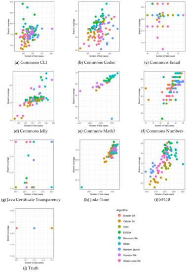 Figure 7 displays the association between the number of test cases and the achieved branch coverage when problem instances were executed using test cases of each algorithm. Several problem instances indicated the EMSGA achieved greater or equal branch coverage while the number of test cases was less than the others. The problem instance Truth is a small-scale program, and the test cases of all algorithms executed a similar number of source code.