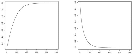 It is easy to check numerically that is decreasing (increasing) and convex (concave) if (). For example, the next Figure 1 displays the graphics of the function for and , respectively. These graphics suggest that is decreasing (increasing) and convex (concave) for ().