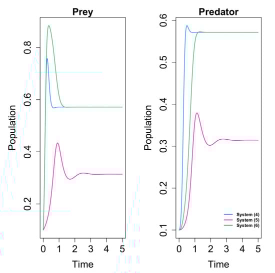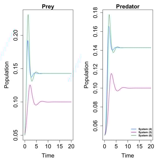 Figure 1. Time–population density of prey and predator for systems (4), (5) and (6). The initial conditions are x ( 0 ) = 0.1 and y ( 0 ) = 0.1 , and the values for the parameters are r = 20 , a = 15 and β = 0.6 .