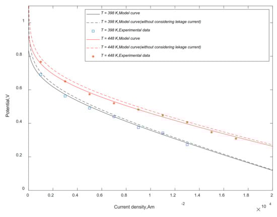 Figure 2 compares model Formula (15) prediction and experimental data at 398 K and 448 K (). The experimental studies in the literature [8] and model studies in the literature [27,38] are both based on HT-PEMFC equipped with PA/PBI membrane and have the same specifications. The results show that the curve predicted by the cell output voltage model has a good agreement with the experimental data. When leakage current is not considered in the model, the output voltage is significantly higher than that predicted by the model, especially in the low current density region. This is mainly because leakage current mainly affects the activation polarization, as shown in Figure 3, the activation polarization potential changes most significantly in the low current density region.