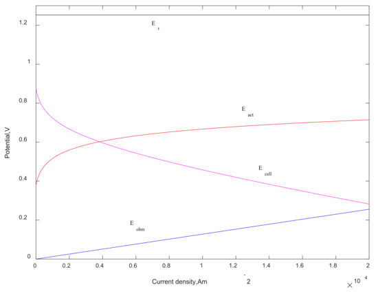 Figure 3 shows the variation curve of reversible voltage, polarized overpotential and irreversible output voltage versus current density of HT-PEMFC. It can be seen that the reversible voltage is a constant independent of current density. The activation overpotential and ohm overpotential increase with the increase of current density, and the activation overpotential changes greatly in the area of low current density. The irreversible output voltage decreases as the current density increases.