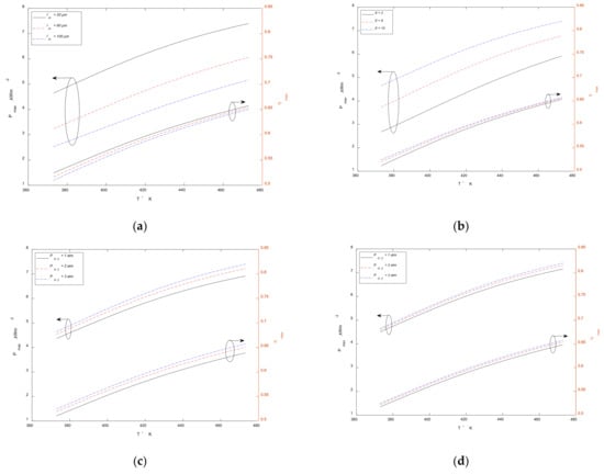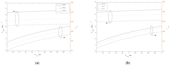 Figure 4a shows the impact of operating temperature on and of HT-PEMFC under different . It can be seen that with the decrease of proton membrane thickness, and will increase. If the thickness of proton membrane is reduced, the barrier of ions passing through proton membrane and the ohmic overpotential decrease. Therefore, and will be improved. When the temperature is 433 K, increases by 50% and the raises by 1.8% under the change of membrane thickness, which indicates that the membrane thickness has little influence on . The reduction of membrane thickness can improve the performance, but fuel penetration, short circuit and other problems always limit the thickness.